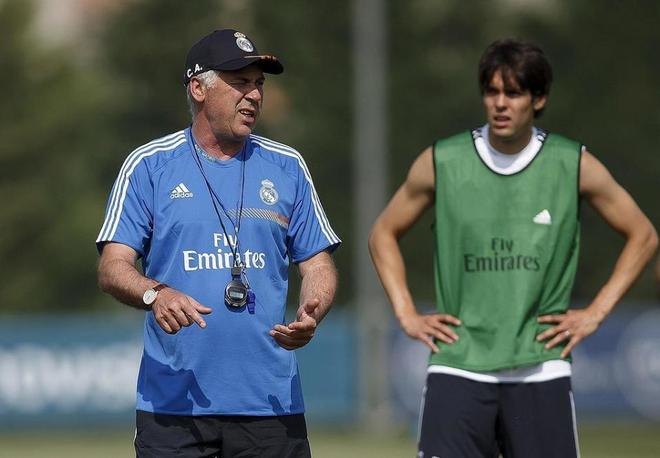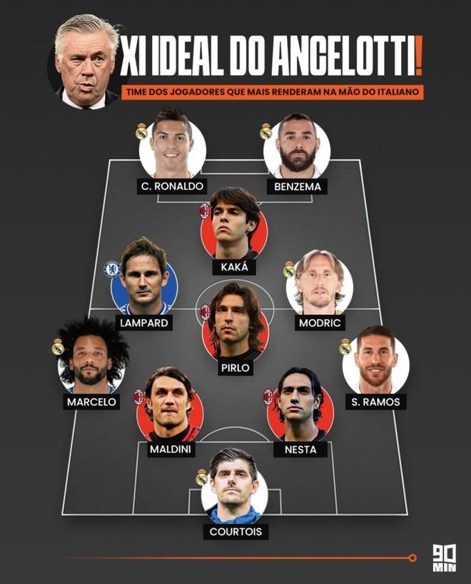近日,足球媒体90 min评出“安切洛蒂理想十一人”,阵型为4-3-1-2,主体由米兰与皇马框架构成:C罗/本泽马双前锋,卡卡居前腰,皮尔洛坐镇中轴,马尔蒂尼配内斯塔压阵,门将库尔图瓦。